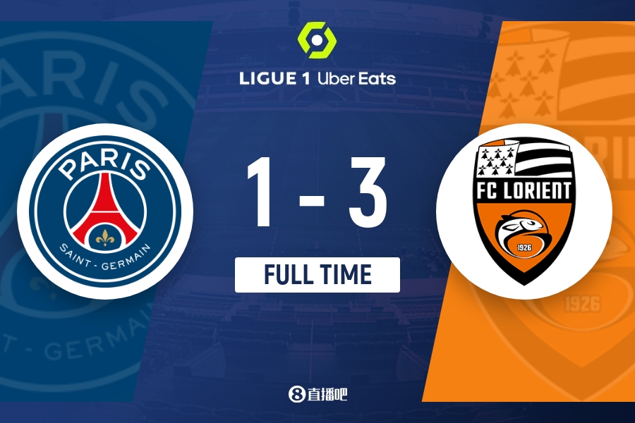 全场比赛结束,巴黎主场1-3不敌洛里昂。