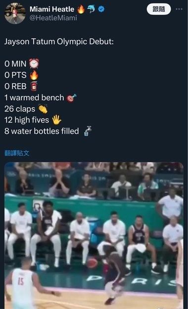 🤣美媒晒塔图姆奥运首秀数据:0分0篮板12次击掌26次拍手8次递水瓶