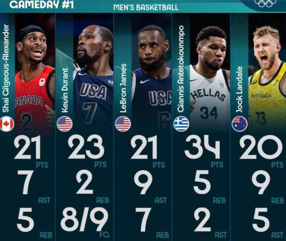 FIBA官网评首轮令人印象深刻数据:詹姆斯&杜兰特&字母哥领衔