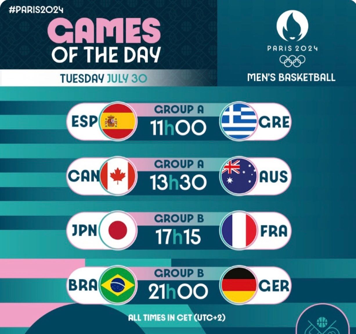 北京时间7月30日,奥运篮球的第四个比赛日,今天我们换换口味,看看男篮的比赛,其中西班牙与希腊的关键比赛,以及澳大利亚与加拿大的强强对话备受关注,A组的形势破朔迷离,而后东道主法国以及世界杯冠军德国也将依序出场。