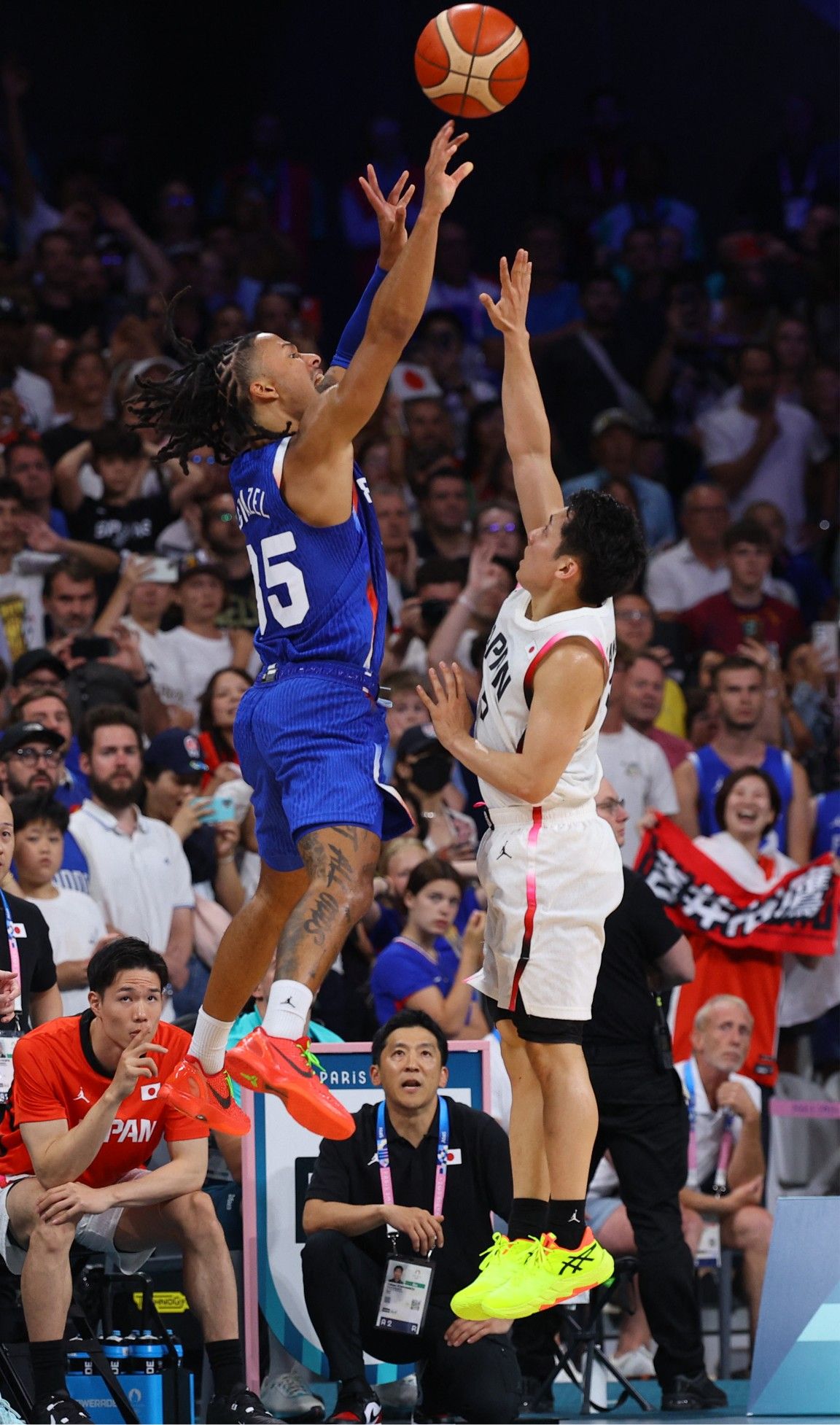 比赛常规时间最后时刻,法国射手斯特拉泽尔强投三分打进,同时裁判吹罚河村勇辉犯规,用神奇3+1把比赛拖进了加时,法国加时苦战取胜。