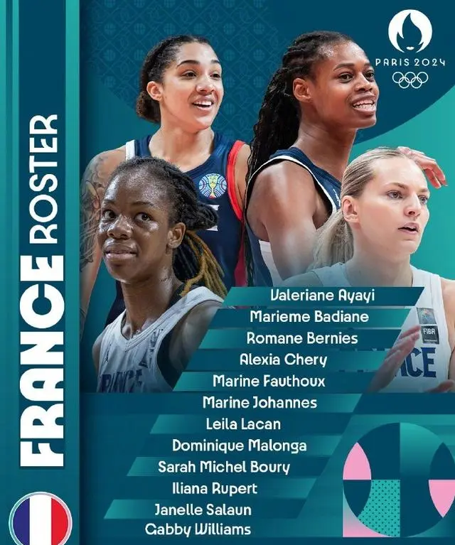 法国女篮12人名单:阿亚伊、巴迪亚内、伯尼斯、切里、福图、约翰内斯、拉坎、马隆加、伯里、鲁珀特、萨兰、威廉斯