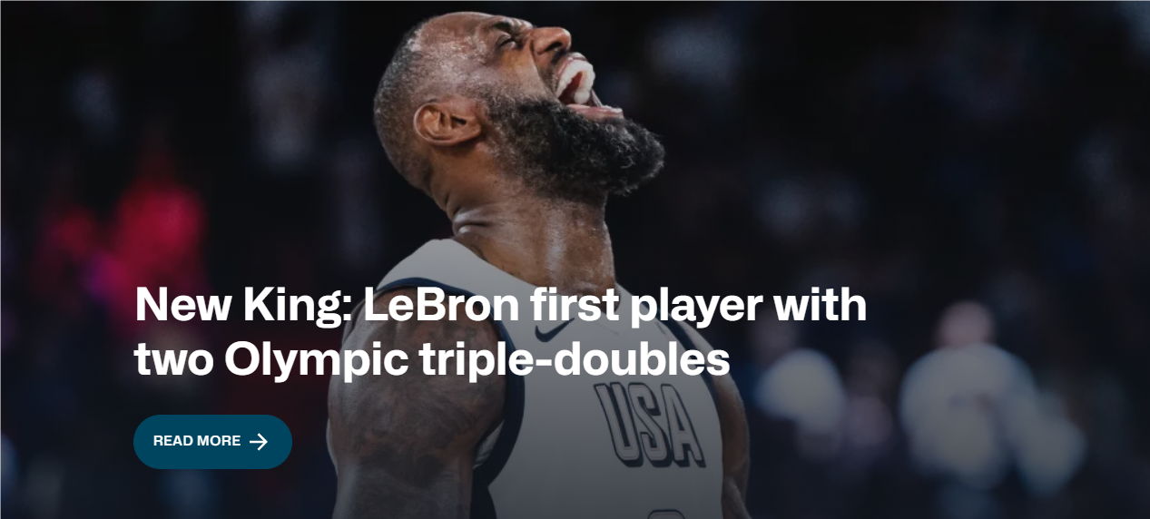 FIBA官网的标题为:《新国王:詹姆斯成为奥运会历史上首位两次拿到三双的球员》。39岁的詹姆斯成为奥运历史上仅有的3位拿到过三双的球员,另外两位是前苏联的比洛夫和斯洛文尼亚的东契奇,詹姆斯是唯一一位两次拿到三双的球员。