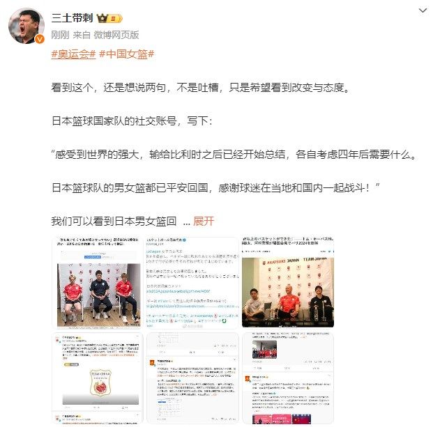 今日,国内体育媒体人@三土带刺发文,谈到中日篮协对待女篮的态度区别。