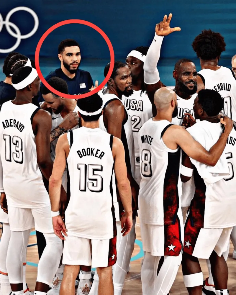 美媒晒出美国男篮晋级时的照片,还特地圈出了塔图姆的表情,在半决赛里,塔图姆没有获得出场时间。