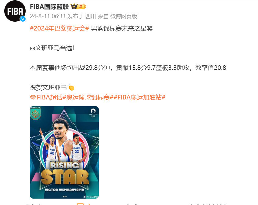 本场比赛赛后,@FIBA官方评选法国球员文班亚马获得本届奥运会男篮未来之星奖。