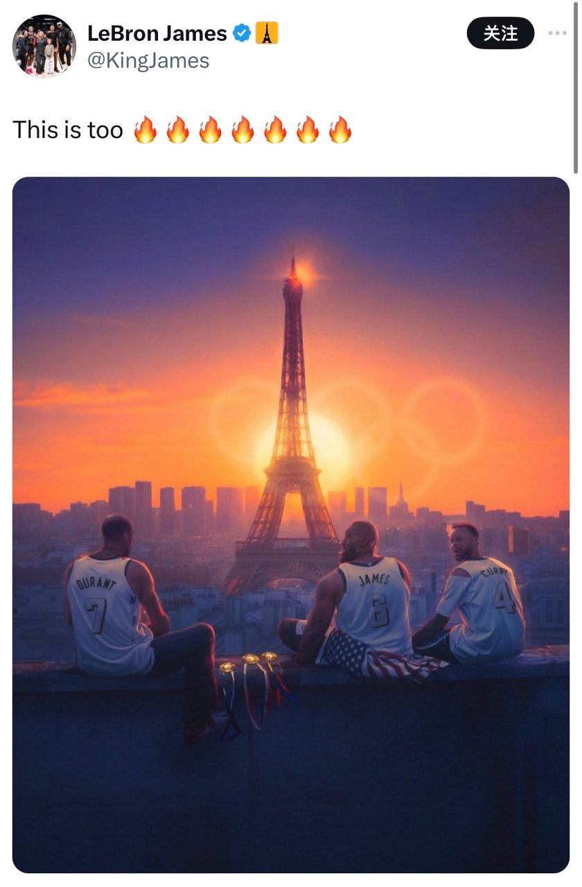 FIBA官方为了纪念这一时刻,请画师xPRKRx绘制了一张詹杜库三人与三枚金牌,美国国旗一起同坐在夕阳下的埃菲尔铁塔前的图画,画面温馨而感动。