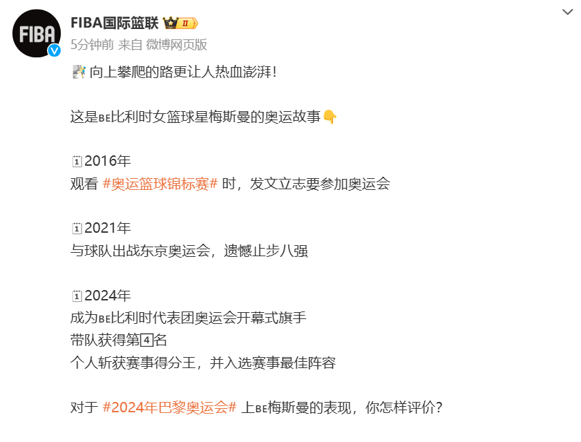 北京时间8月15日讯,@FIBA官方发文讲述比利时女篮球星梅斯曼的奥运故事。原文如下: