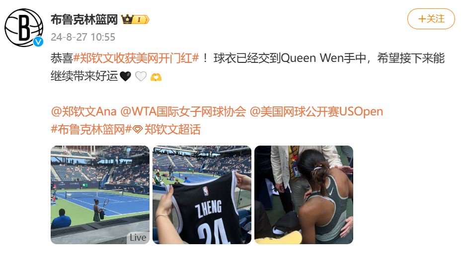 北京时间8月27日讯,@布鲁克林篮网社媒祝贺郑钦文收获美网开门红。原文如下: