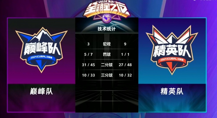 次节开局付永康上来两记三分带领精英队缩小分差,但精英队随后几波攻势都无法轻松拿分,反倒是巅峰队开局效率不算高的情况下及时调整过来,吴泽昊和柳锐相继拿分将优势拉大至两位数。最后时刻吴超和张恒硕互飚三分,巅峰队51-39领先精英队结束上半场。