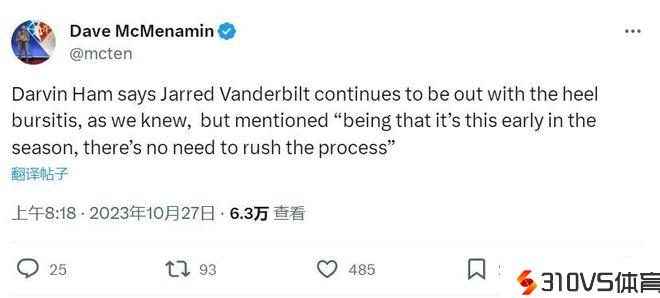 范德彪本赛季只打了第1场季前赛,之后延续列席7场(5场季前赛和2场惯例赛)。保守估量,范德彪要缺阵20场左右,11月份能否看到他还是未知数。等到范德彪复出,他将回到首发阵容,伙伴詹姆斯、浓眉、里夫斯和拉塞尔。