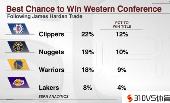 哈登加盟后快船夺冠概率提升4% 反超掘金胆小鬼升至西部第一