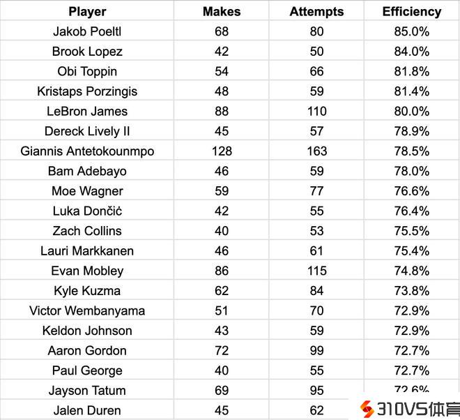 联盟攻筐效率TOP20:字母哥产量无敌 詹姆斯有质有量!