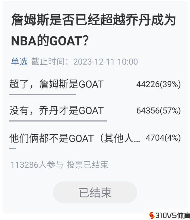 大约有11万人投票,选择超了乔丹的占39%,选择没超的是57%,以为一样都是goat的是4%,效果不大,毕竟季中锦标赛冠军的热度加上詹姆斯的热度,还是有不少人投给了老詹,假设往年湖人能冲击总决赛,拿下总冠军,那么这个票数还会更高,不敢想了。