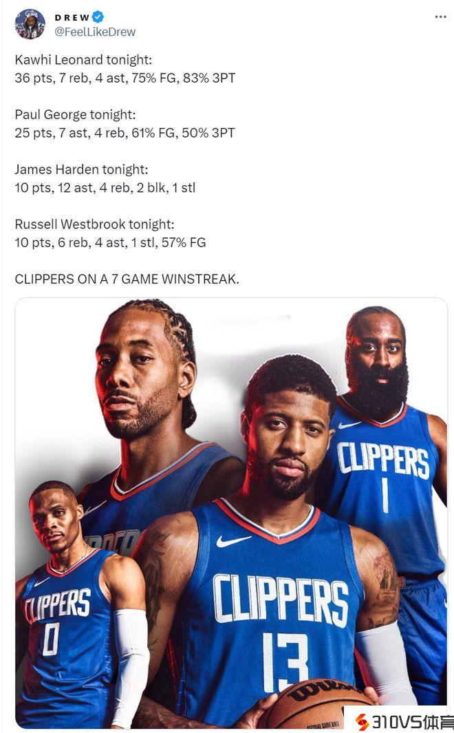 快船的四巨头得分全部上双,小卡30分钟,16中12拿30分7篮板4助攻;乔治31分钟18中11拿25分7助攻4篮板;哈登28分钟拿10分12助攻4篮板;威少15分钟拿10分6篮板4助攻。这似乎曾经成为快船赢球的常态,四巨头均有不俗发扬。