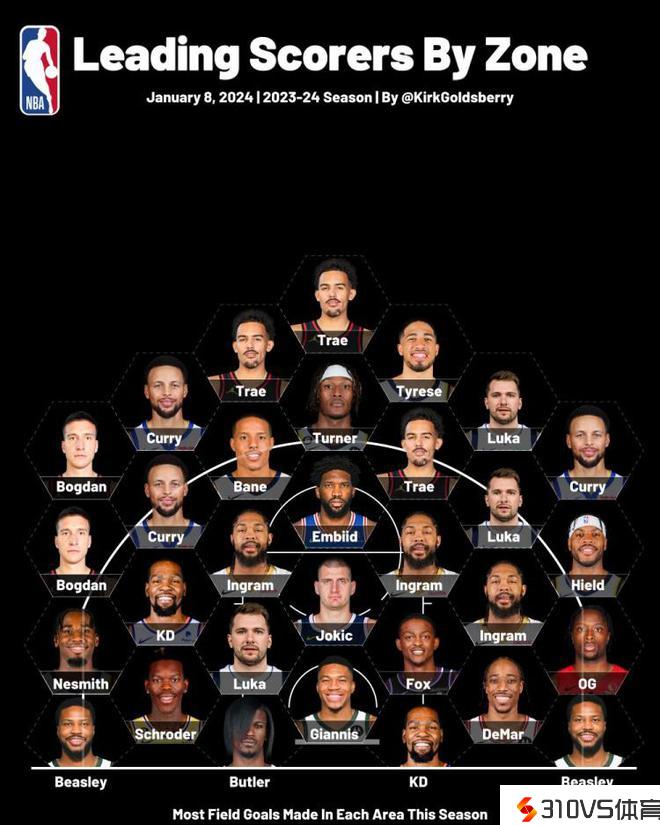 美记统计赛季至今各区域得分王:字母统治外线 比斯利称霸底角