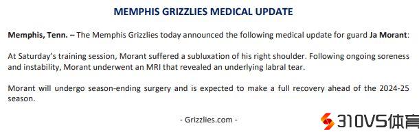 灰熊官方:莫兰特将接受肩部手术 赛季报销