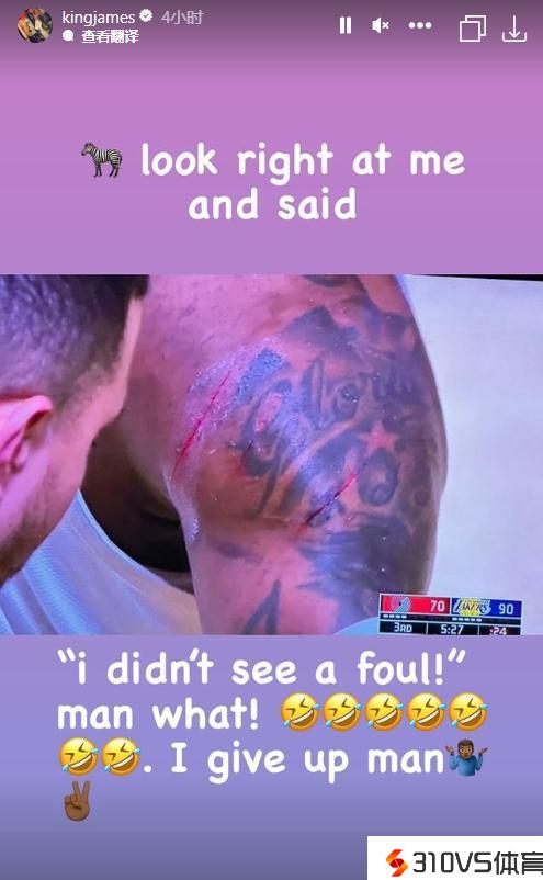 詹姆斯晒伤口:裁判说“我没看到犯规” 佛了♂️