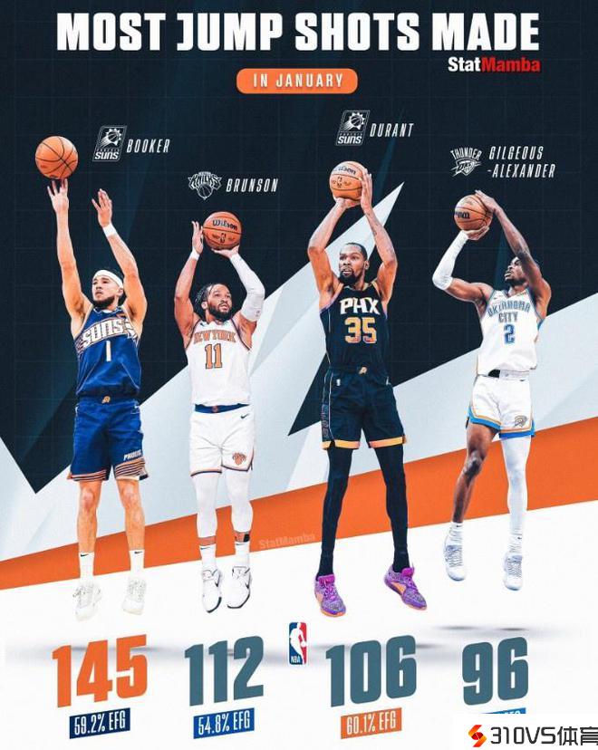1月跳投数据:杜兰特有效命中率居首 布克命中数最多