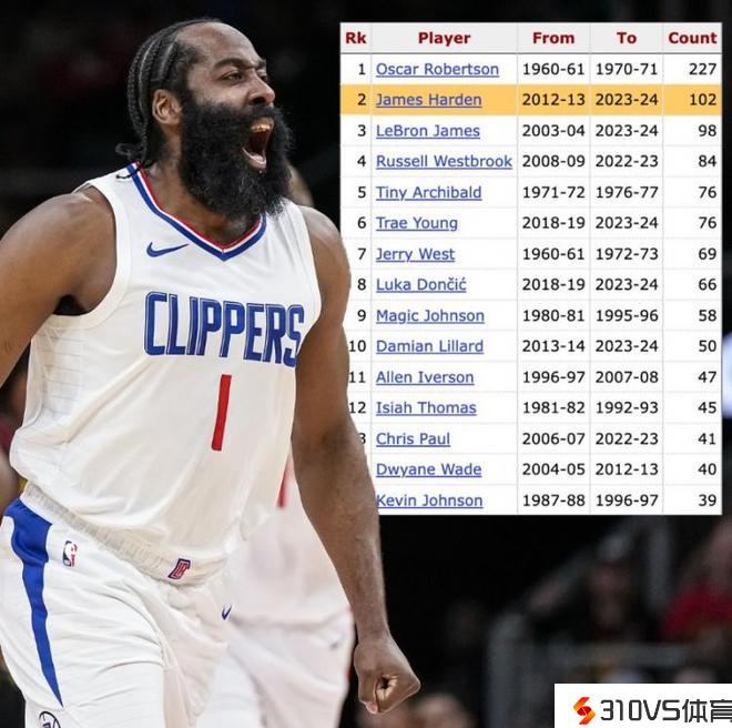 NBA历史仅有两人单场至少30分10助场次过百:哈登&大O