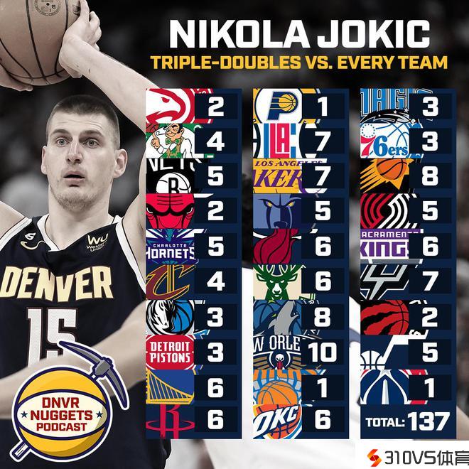 3、比肩威少和詹姆斯,成为第三位对任何球队都有三双的球员。值得一提的是,威少和詹姆斯是达成30队三双的壮举,也就是说,除非约基奇换队,否则他无缘追平詹威。