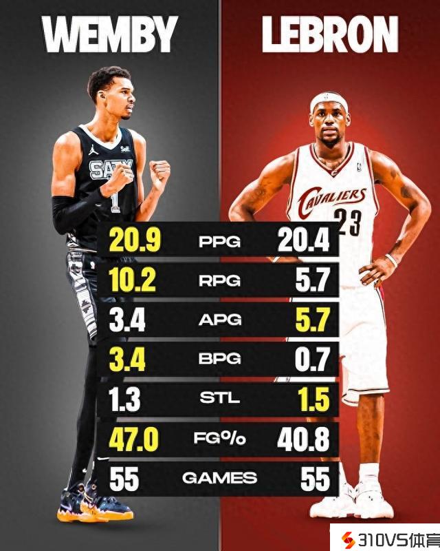 文班&詹姆斯生涯前55场数据对比:两人得分相仿 文班盖帽占优