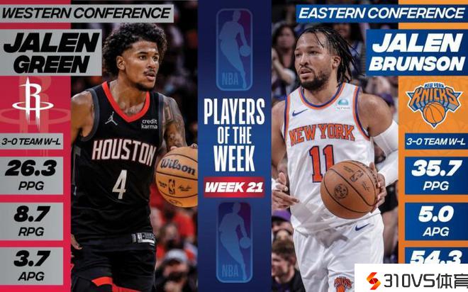 周最佳:杰伦-格林场均26.3分8.7板3.7助 布伦森场均35.7分5助