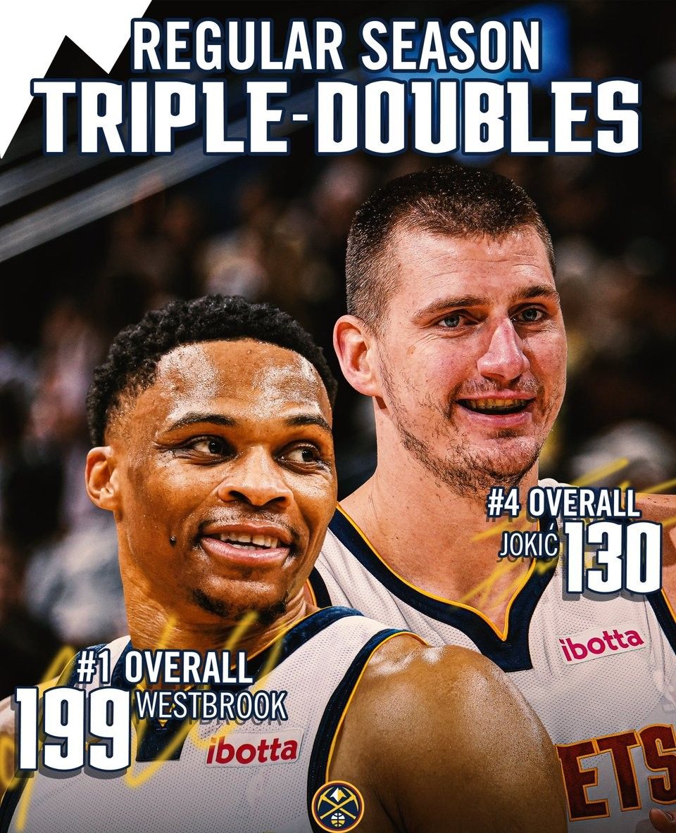 威少目前砍下199次三双是NBA历史上的三双王,而约基奇以130次三双排名NBA历史第四。他们合计的329次三双比其他29支球队的任何一支球队的三双都多(湖人最多316次)。