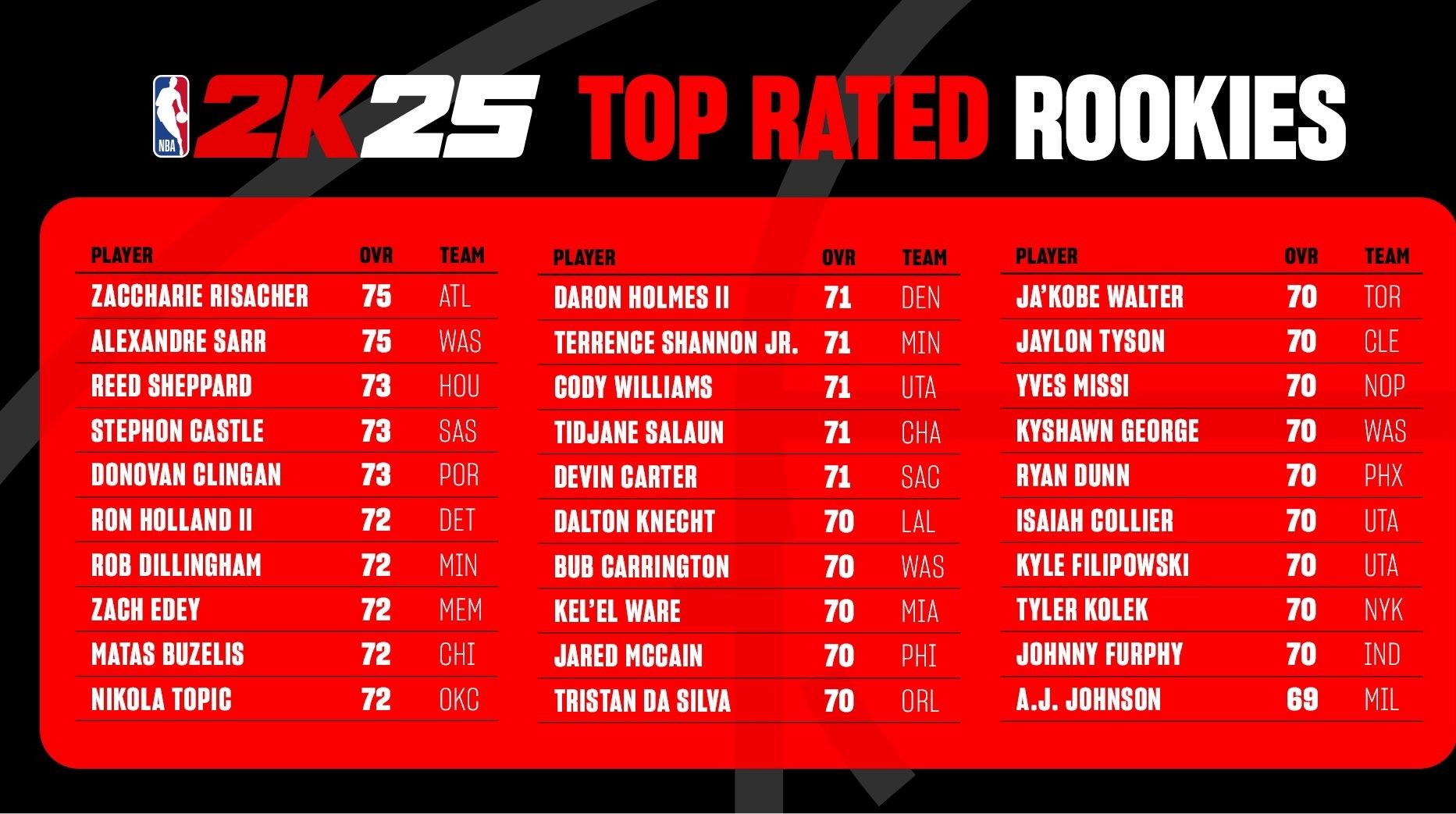🌟NBA 2K25新秀能力值:里萨谢&萨尔75 谢泼德73 布朗尼68