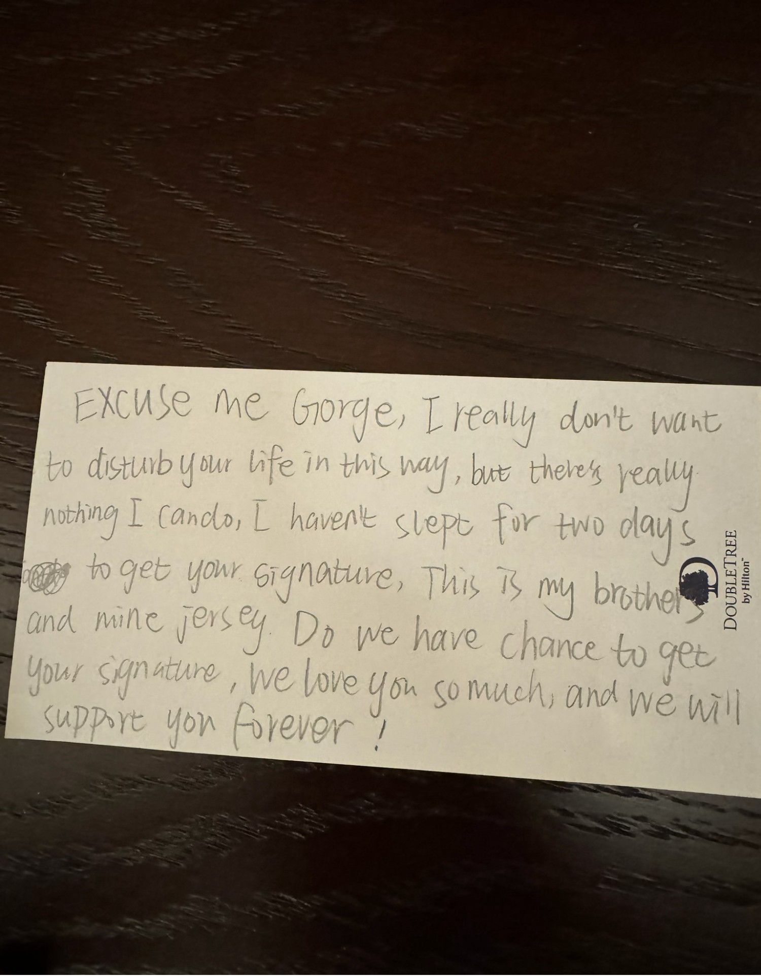 “昨天PG晚上回酒店签了很多球迷,但后面球迷在车库聚集推搡出现安全隐患,喊了几次后无果我不得已把他拉走了,理解球迷喜欢PG,但不知怎么我们包下一层行政楼层后,球迷依然找到了PG的房间,导致PG今早心情全无,这种行为请勿发生。
