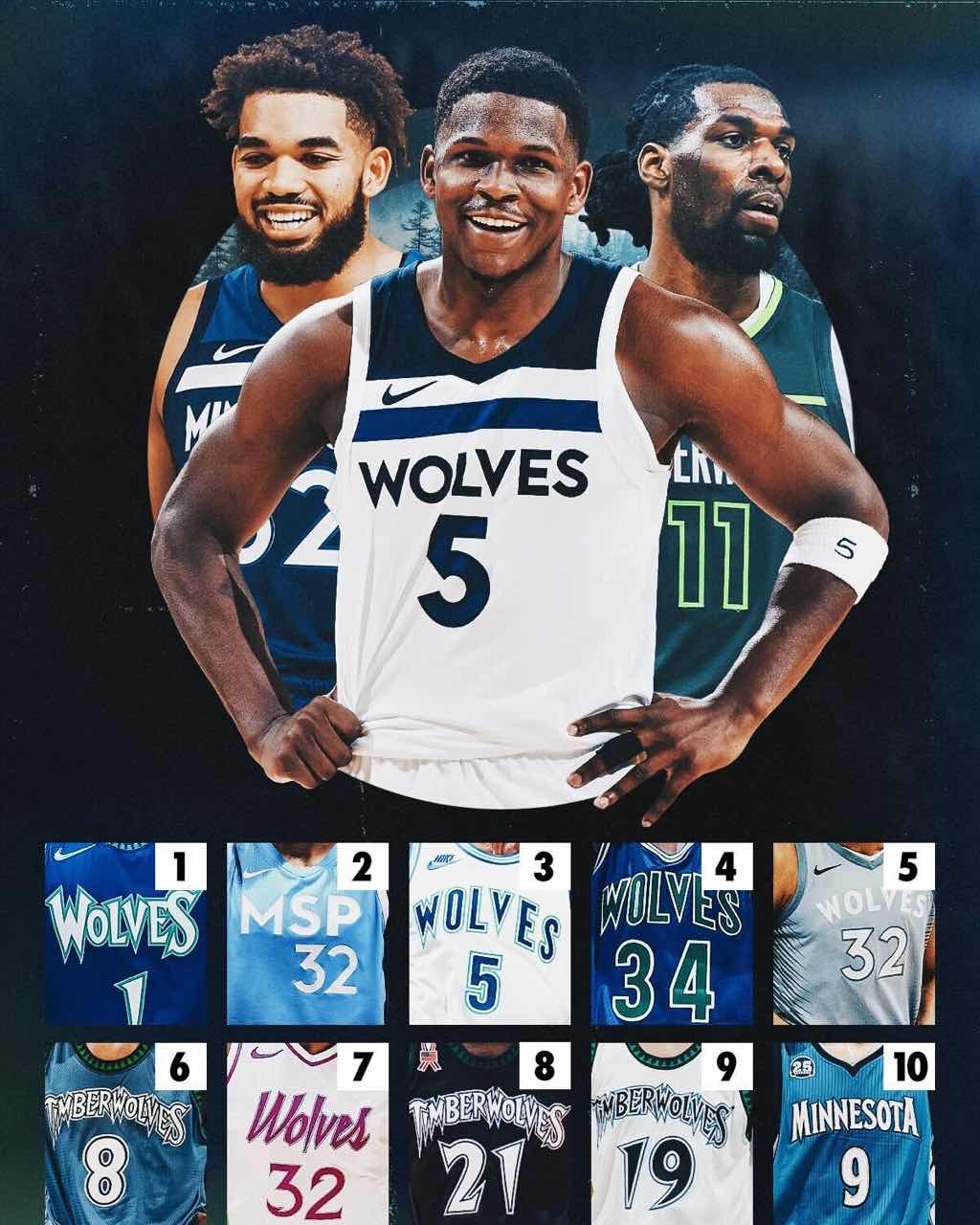 今日,森林狼官方社媒发布了10套球队各时期的代表性球衣。