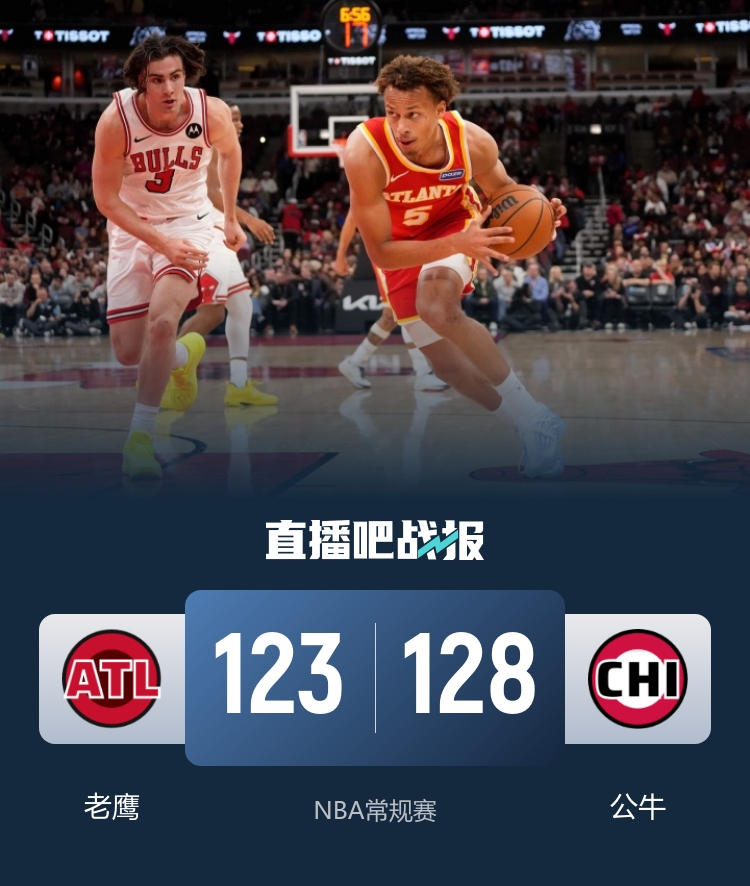 比赛开始,波尔津吉斯里突外投连砍10分状态火热,公牛连续突破止血,随后老鹰继续发力拉开双位数领先,公牛连续三分追到差8分,次节双方展开拉锯战,吹杨三分命中再次拉开双位数领先,公牛全民皆兵连续杀伤后外线又接连发炮咬到差1分。下半场,双方上来外线对飙,比分多次打平,布泽利斯和奥科罗连续反击暴扣,公牛单节轰出41分一度反超到10分,末节老鹰上来9-2又反超回来,但公牛全面皆兵还能稳住局势,比分持续胶着进入白热化,布泽利斯三分加反击领先5分,沃克三分再打回悬念,最终公牛128-123险胜老鹰。