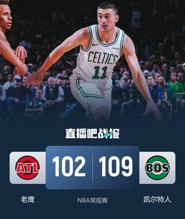 比赛上来,两队短暂拉锯后老鹰打出一波9-0的小高潮取得领先,分差也是很快达到两位数,好在是凯尔特人在首节末段利用10-0的攻势止血,他们在次节成功抹平分差,两队之后展开拉锯,半场结束时老鹰仍领先5分;下半场回来,普理查德的外线突然投开,他个人连中三分球直接带队完成反超,末节双方进攻表现都不算好,但凯尔特人没有给老鹰逆转的机会,塔图姆关键三罚直接杀死比赛,最终凯尔特人力克老鹰,终结了后者的三连胜。