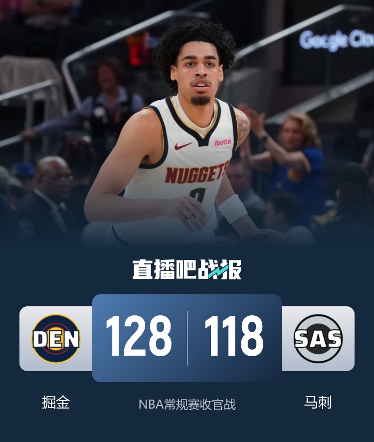 比赛开场,双方比赛强度不大,展开对攻,斯特劳瑟三分连续命中,马刺这边也是连连作出回应,首节结束掘金37-34领先。次节回来,柯蒂斯·琼斯连中三分掀起攻击波,马刺一度陷入得分荒,约基奇连续打成带领掘金打出一波20-0一举将比分拉开。易边再战,约老师不再出场,马刺趁机开始追分,但随后掘金众人发力还是稳住比赛局势,双方分差在10分上下浮动,三节结束掘金101-91保持领先。末节回来,马刺一度将分差缩小到6分,但此后瓦兰撑起掘金进攻,帮助球队连续得分再次将比分拉开,不过下半节瓦兰下场后马刺继续追分,但三分连续不中没能改变比赛结果,掘金128-118力克马刺。