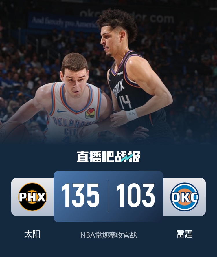 首节对决太阳迅速进入状态轰出26-8的进攻高潮迅速接管比赛,雷霆则状态糟糕前8分钟里仅得8分,糟糕的第一节也直接奠定他们一路被动追分;次节雷霆进攻端回暖但也阻止不了对手,两队次节双双砍下33分,太阳这边邓恩和布耶联手砍下34分带队取得18分领先进入下半场。休息归来雷霆表现依旧不愠不火,太阳则连续三节轰下30+得分势不可挡,三节结束时分差已经来到27分,末节也早早进入练兵时间没有再起波澜。最终,太阳客场大胜雷霆拿下比赛为常规赛画上圆满句号。