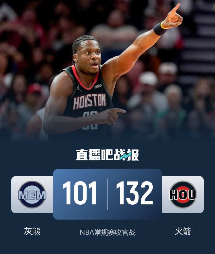 比赛开始,泰特里突外投帮助火箭打开局面,但怀特黑德连续3记三分回应,随后火箭10-0建立主动权,灰熊迅速回应8-0,火箭10-0领先6分,次节双方展开拉锯战,火箭里突外投12-0直接拉开20分以上领先,半场火箭领先21分。下半场,双方继续拉锯战,卡佩拉接连内线吃饼,谢泼德找到外线手感接连命中,火箭扩大到30分以上领先,末节火箭11-2继续扩大领先,随后双方开始练兵,最终火箭132-101大胜灰熊。