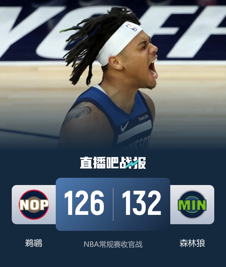 首节开打后森林狼内外结合开局7-0占优,霍金斯联手费尔斯短暂回应,森林狼多点开花确立优势,首节结束时森林狼领先10分,次节回来,两队拉开架势继续对攻,森林狼总能回应牢牢占优,半场战罢,森林狼继续领先14分。短暂休整后森林狼进攻出现停滞,费尔斯和奎因率队不断蚕食分差,三节结束后森林狼依然领先7分,末节决战,鹈鹕没有放弃继续追分,分差一度只剩4分,贝兰热连投带罚守住胜果,最终森林狼132-126力克对手。