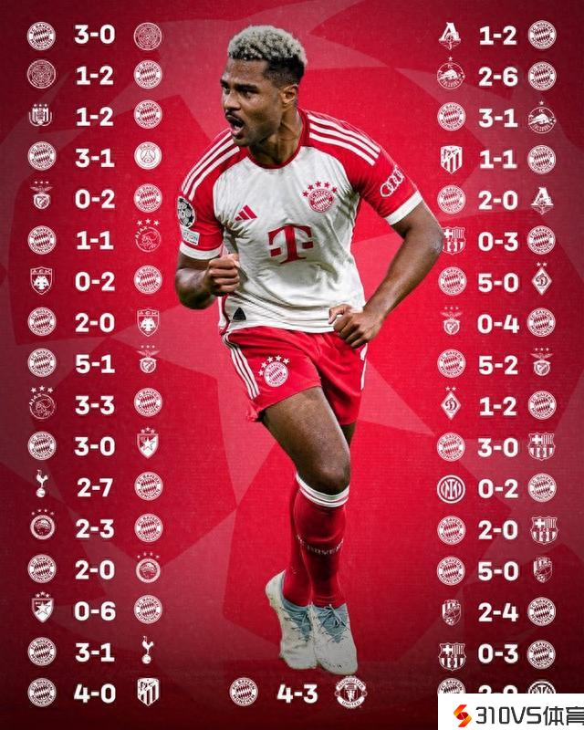 拜仁延续35场欧冠小组赛坚持不败,战绩32胜3平