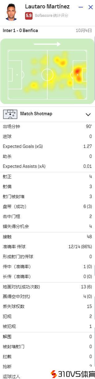 明天是马丁内斯劳塔罗全场数据:4次错失时机,5.9分全场最低