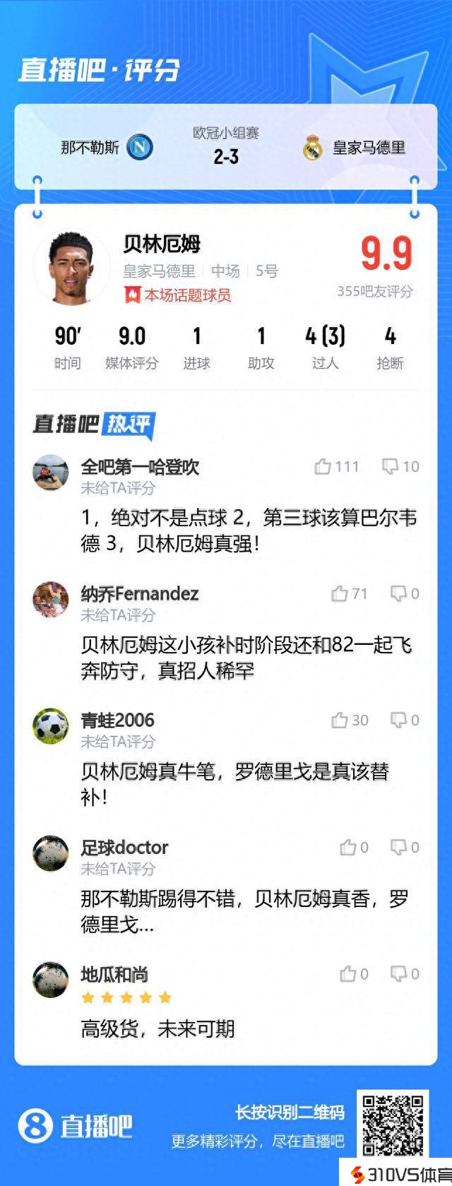 吧友评分 | 贝林获9.9分:补时还和巴尔韦德飞奔防卫,真招人稀罕