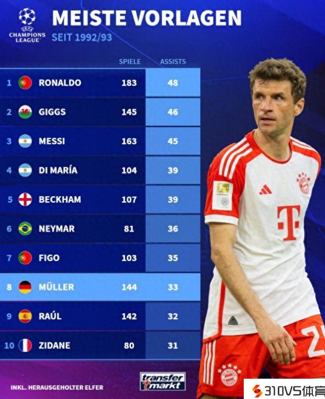 欧冠助攻榜:C罗48助居首,吉格斯、梅西二三位&穆勒33助第8