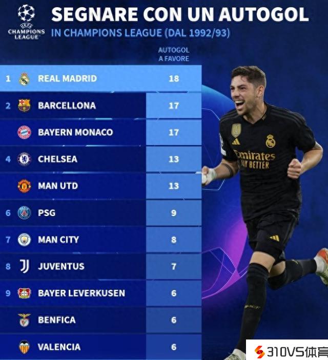 欧冠赛场造对手乌龙球前十:皇马18球第一,巴萨拜仁并列第二