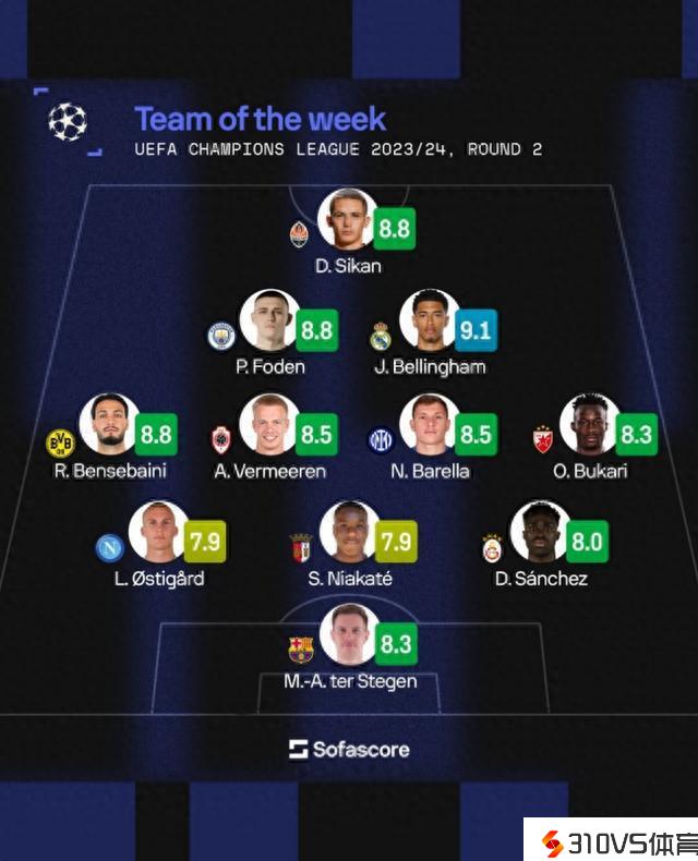 Sofascore欧冠本周最佳阵:福登、贝林厄姆、巴雷拉、特狮在列