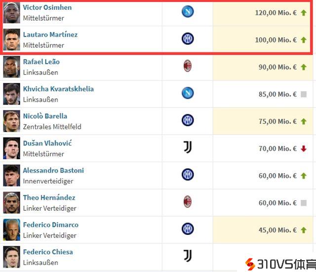 意甲最新身价!仅2人过亿,前10无罗马球员,卢卡库才4000万