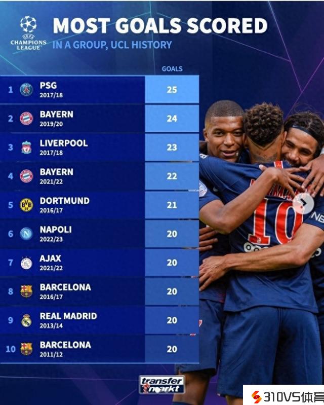 单赛季欧冠小组赛阶段进球榜:巴黎17/18赛季25球最多,拜仁次席
