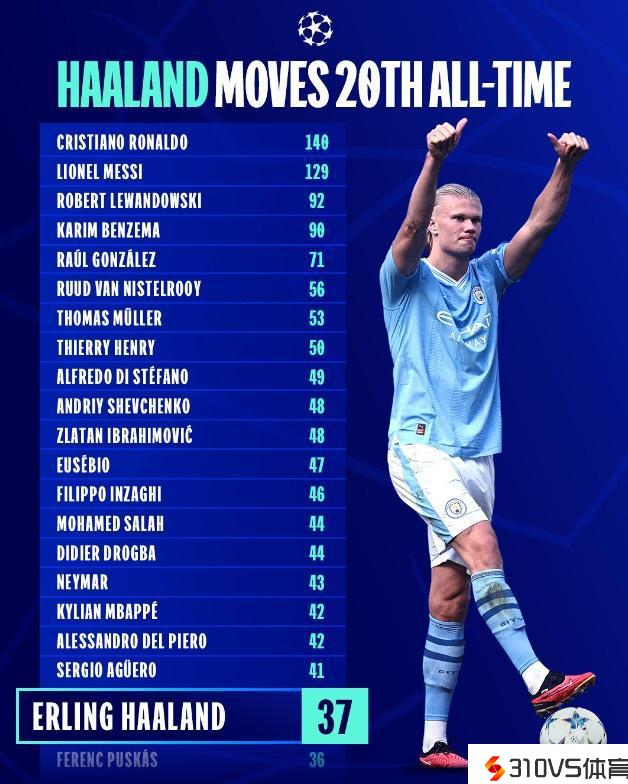 欧冠历史射手榜:哈兰德33场37球逾越普斯卡什,升至第20位