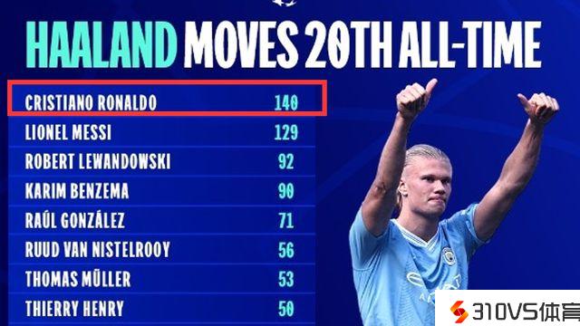 本场梅开二度后,哈兰德生涯在欧冠曾经打进39球,而且他仅用了34场竞赛,就取得这个成就,哈兰德也成为欧冠历史上射手榜前50名当中,唯逐一个进球比出场次数更多的球员,他的效率真实太恐惧了。