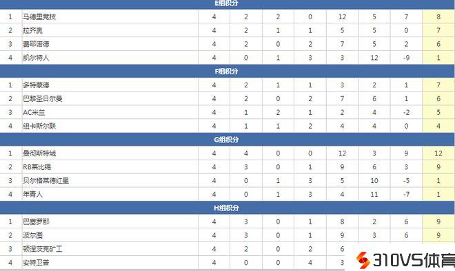 欧冠最新积分榜