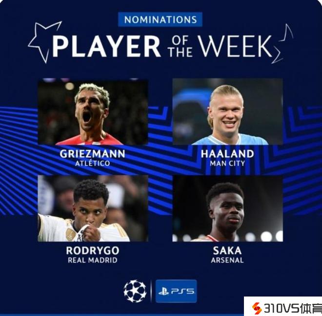 欧冠官方本轮最佳球员候选:哈兰德&格列兹曼&萨卡&罗德里戈