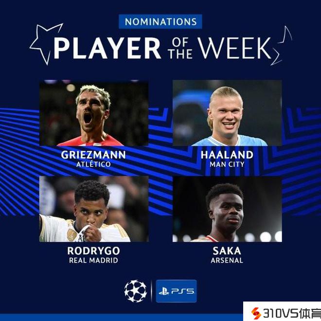 欧冠周最佳球员候选:哈兰德、格列兹曼、萨卡、罗德里戈